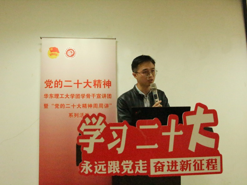 11月22日下午,由校团委主办,机动学院团委承办的党的二十大团学骨干宣讲团“党的二十大精神周周讲”系列首场宣讲活动在奉贤校区大活215举行。2019年度“中国大学生自强之星”、2020上海大学生年度人物获得者、350vip浦京集团官网博士后刘懿谦做了主题为“服务海洋强国战略 把论文写在蓝色国土上”的宣讲。