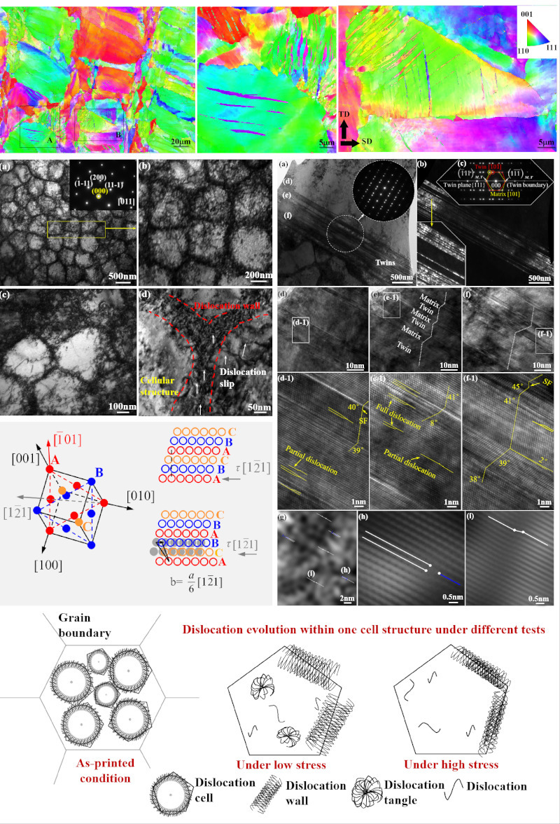 近日,350vip浦京集团官网的硕士研究生陈亦楠围绕L-PBF增材制造面心立方晶体(FCC)结构的CoCrFeNi高熵合金在交变载荷工况下的疲劳行为及损伤演变机制持续深入研究;发现激光快速非平衡熔凝的CoCrFeNi微观结构含有高密度的小角度晶界、异常显著的晶内胞状亚结构和原子堆垛层错特征,促使在较低应力水平的交变应力下诱发大量纳米孪晶,建立和阐明了上述因素交互作用的物理机制模型;探明了在L-PBF增材制造CoCrFeNi疲劳行为中的位错胞(Dislocation cells)演变过程及其与晶内胞状亚结构(Cellular structures)的交互作用机理,位错受胞壁结构(Cellular walls)阻碍、在一定范围往复移动导致位错湮灭、解离和重排,位错重排则倾向于形成较低能量构型,即具有交替高-低密度位错区域的新型位错胞壁(Dislocation cell-walls),这不仅改善了高周疲劳性能,同时能阻碍位错的大范围移动,为反应生成纳米孪晶提供了更大可能;此外,通过施密特因子计算及相同尺寸、不同取向的晶粒内部诱发孪晶比例量化对照,意外发现L-PBF增材制造FCC系列HEAs纳米孪晶更易在<110>取向的晶粒内部产生,这可为通过L-PBF激光工艺改变微观晶粒取向分布、实现构-性精准调控和强韧取向性的人工设计,提供新的可行路径。