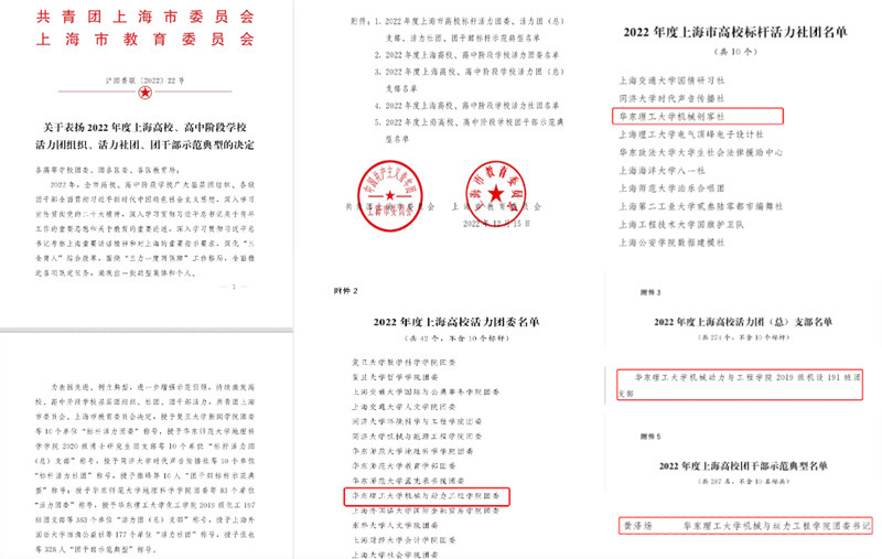 近日,共青团上海市委员会、上海市教育委员会公布了《关于表扬2022年度上海高校、高中阶段学校活力团组织、活力社团、团干部示范典型的决定》(沪团委联〔2022〕22号),我院多个集体和个人荣获表彰。其中,我院团委被授予“上海市高校活力团委”称号,机设191班团支部被授予“上海市高校活力团支部”称号,机械创客社团被授予“上海市高校标杆活力社团”称号(上海10个),黄泽炀被授予“上海市高校团干部示范典型”称号。